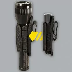Nite Ize Lite Holster with Stretch. This universal nylon holster stretches to fit most shapes and sizes of flashlights – from 5/8″ to 1-1/2″. Fits most AAA, AA, CR123A, C-cell and D-cell flashlights. Durable belt clip attaches to belts up to 1-1/2″ wide. Clip will pivot up to 360 degrees to give you hands-free light. Open top and bottom.
