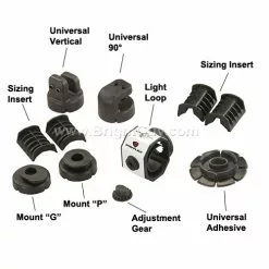 • includes 5 helmet mounts, 1 light loop, 4 sizing inserts, allen wrench and adjustment gear (flashlight NOT included)
