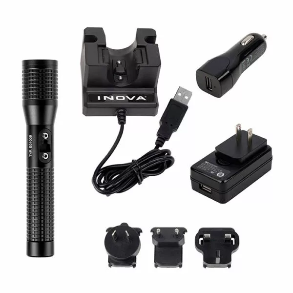 What’s included: Inova T4R PowerSwitch, rechargeable battery, charging cradle, AC & DC adapters, international adapters