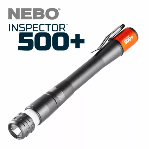 What’s included: NEBO Inspector 500+ penlight flashlight, pocket clip, rechargeable battery, USB cable (charging plug adapters available separately, see accessories below)