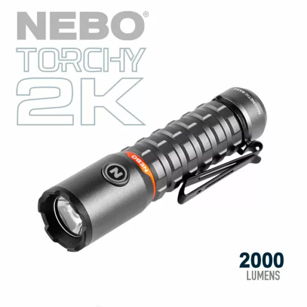 What’s included: NEBO Torchy 2K flashlight, rechargeable battery, 2-way clip, magnetic charging cable (wall plug charging adapter available separately – see accessories below)