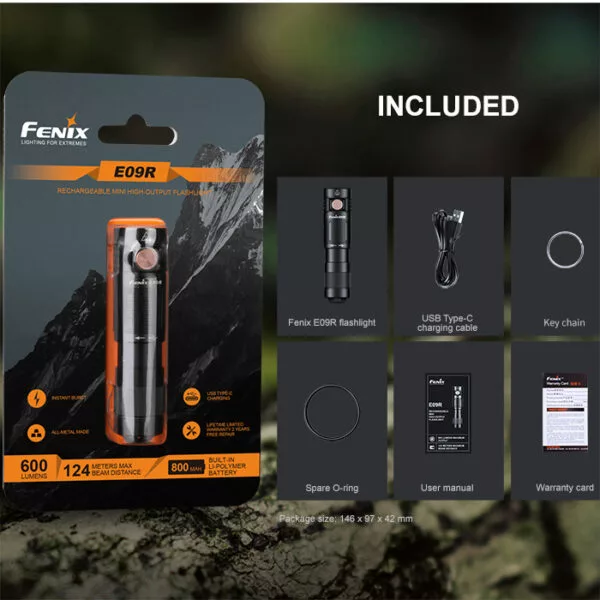 What’s included: Fenix E09R EDC light with built-in rechargeable battery, USB-C cable, split ring and spare O-ring (wall plug charging adapter available separately – see accessories below)