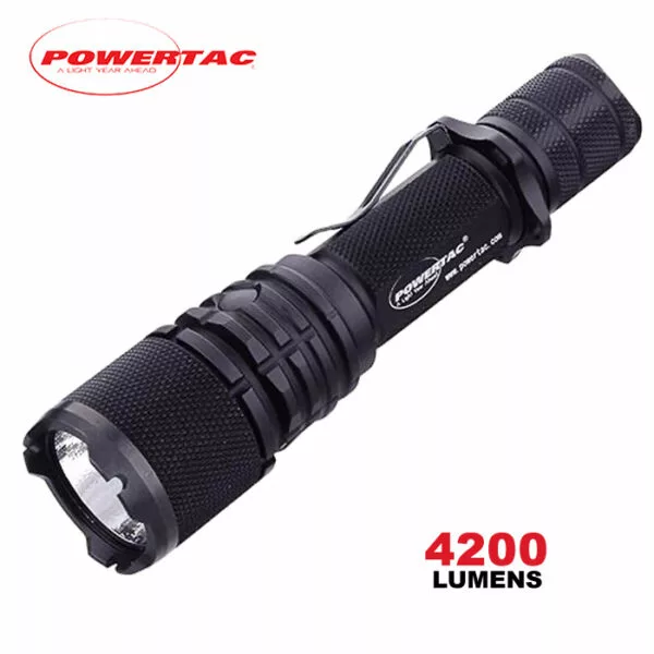 What’s included: Powertac Warrior G4FL® flashlight with grip ring and pocket clip, rechargeable battery, magnetic charging cable with USB plug (charging adapters sold separately), lanyard, split rings, engineered polymer clip-on holster, carrying case and spare O-ring