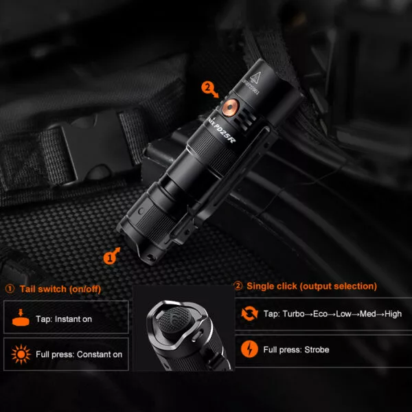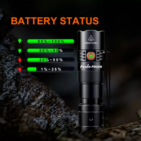 What’s included: Fenix PD25R flashlight, rechargeable battery, USB-C cable, nylon belt holster, lanyard, spare O-ring