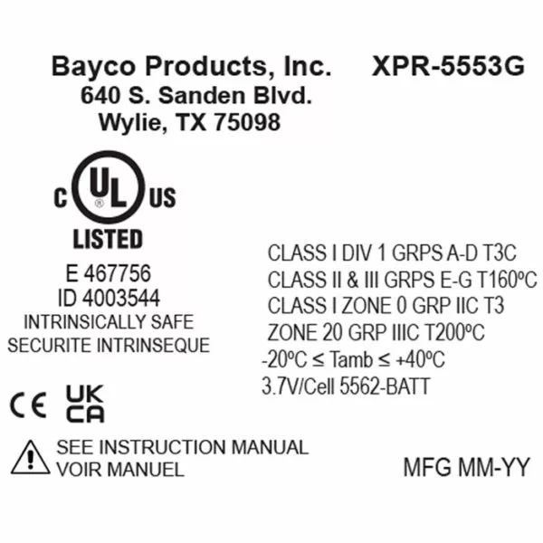 Intrinsically Safe, Class I Div 1 Grps A-D T3C, Class II & III Grps E-G T160°C, Class I Zone 0 IICT3, Zone 20 Grp 3C T200°C