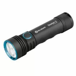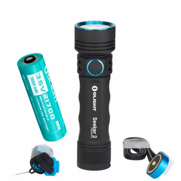 What’s included: Olight Seeker 2 flashlight, rechargeable battery, charging cable with magnetic base, wrist lanyard (AC wall charging adapter available separately – see accessories below)