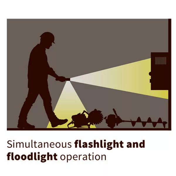 ▹ bottom switch activates flood beam (light is emitted from side of flashlight)