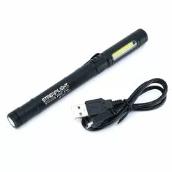 What’s included: Streamlight Stylus Pro COB rechargeable flashlight with pocket clip and USB charging cord (plug adapters available separately); NOTE – charge before using to disable “Try Me Mode”